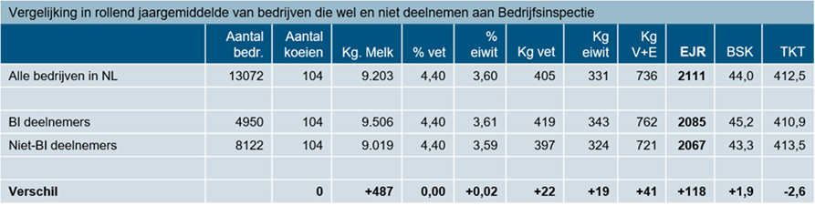 De resultaten op de 4.950 bedrijven die deelnemen aan mpr en regelmatig bezocht worden door de stamboekinspecteur, steken hier positief bij af. Ten opzichte van de 8.122 niet-deelnemers aan bedrijfsinspectie produceerden de koeien op deze bedrijven gemiddeld 487 kg meer melk met een 0,02% hoger eiwitpercentage, resulterend in 41 kilo extra vet en eiwit en een 118 euro hoger ejr.